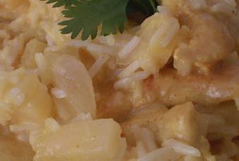 Para prepararlo he usado los siguientes ingredientes: Una bolsa de arroz tipo basmati, una lata de piña en almibar, la parte blanca de una cebolleta (o cebolla dulce), 3 cucharadas de vino de arroz (en su defecto vino blanco), una cucharada de vinagre de arroz, una cucharada de salsa de soja, tres cucharadas soperas de aceite sésamo, una cucharada de curry en polvo, dos pechugas de pollo troceadas.