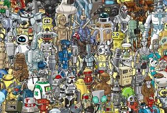 Mis ávidos y queridos lectores, ¿Os aburrís? Pues os propongo encontrar a Wall-E entre esta maraña de tuercas, botones y circuitos que dan forma a casi todos los robots que hemos visto en el cine y la televisión. Terminator, los de Perdidos en el espacio, C3PO y R2D2 (por supuesto), Bender … Incluso el hombre bicentenario o el buho de “Furia de titanes”. Ale buscad, buscad