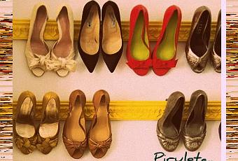 En simples baldas, puestas en paralelo y con poco espacio entre ellas, los zapatos se sujetan de la punta...