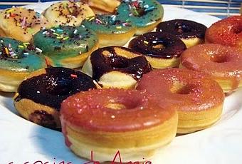 - Preparar la glasa mezclando 225 grs. de azúcar glas, ½ cdta. de esencia de vainilla y 4 cuch. de leche. Mojar los donetes en la glasa y decorar con fideos de chocolate de colores, o cubrir con chocolate fundido.