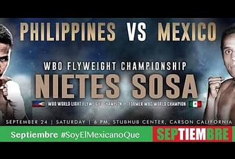 Donnie Nietes vs Edgar Sosa se enfrentan a 12 rounds, por el título vacante WBO Inter-Continental, en la categoría de peso mosca este Sábado 24 de Septiembre del 2016 en una función boxística que inicia a partir de las 10:35PM Hora de México ( Ver Hora en tu Pais), en una pelea de box que será transmitida en el canal Azteca 7 de Television Azteca, Por cierto TV Azteca transmite las peleas de Box por Internet, así que les dejamos el enlace para que la vean en vivo y totalmente gratis esta gran función de box...