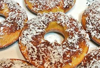 Preparación 1. Precalentar el horno a 180°C. 2. Mezclar los ingredientes secos. 3. Mezclar los ingredientes húmedos en otro bol y luego añadirlos a los secos. 4. Batir hasta que la mezcla esté suave y rellenar la bandeja para donuts. 5. Hornear 10 minutos (no hay que pasarse porque si no saldrán secos). 6. Para la cobertura, triturar con la batidora los dátiles con la mantequilla hasta que tengamos una pasta. 7. Sacar los donuts del horno y, cuando todavía estén calientes, untar la cobertura por encima. 8. Poner el coco rallado en un plato y pasar los donuts por el lado de la cobertura para que se les pegue el coco, ¡y a disfrutarlos! :)
