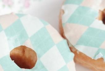 Recortar y humedecer ligeramente el donuts con un poquito de agua lo suficiente para que el papel se quede pegado a la glasa.Presionamos un poco con los dedos y dejar reposar toda una noche, es importante ya que con el calor y la humedad el papel perderá la rigidez y cogerá la forma del donuts.¡Voilà! Listo para comer o impresionar!