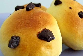 La receta original la podeis encontrar Aquí Y ahora a lo que vamos, como se hace..?Yo la hice en la panificadora, muy fácil y además muy limpio, si no disponéis de ella lo amasáis como toda la vida, haciendo un volcán de harina en la mesa de trabajo y en el centro le vamos amasando los ingredientes poco a poco, dejando que leve lo suficiente entre amasado y amasado. 110gr de leche tibia12´5 gr de levadura fresca30gr de aceite de oliva suave1 huevo1 cucharadita de esencia de vainilla250gr de harina de fuerza40gr de azúcaruna pizca de salPepitas de chocolate (Yo no tenía así que corté a cuchillo chocolate puro)Disolvemos la levadura en la leche tibia y removemos.Echamos los ingredientes menos el chocolate en la panificadora tal como indica el orden, del huevo solo echamos la yema, clara la reservamos para pintar los panes. (Yo tuve un percance con la clara así que no la pude usar y los pinté de leche)Programamos el programa de amasar que en mi panificadora es 1 hora.Una vez terminado el tiempo amasamos de nuevo en la mesa de trabajo y le añadimos el choco, hacemos bolitas pequeñas y las dejamos en la placa de horno separadas unas de otras.Yo las tape con un trapo limpio y las dejé reposar por lo menos 2 horas dentro del horno apagado para que no tuvieran corriente.Pracalentamos el horno a 180º , pintamos las bolitas que habrán doblado el volumen y horneamos 20 minutos.