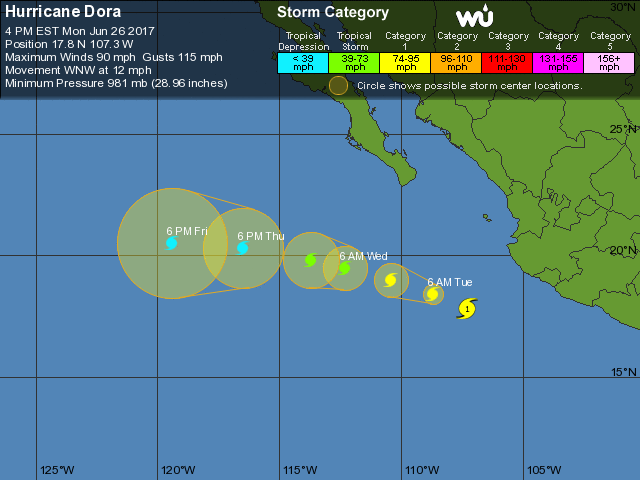 Lo más importante para destacar es que "Dora" empezará a perder su fuerza en las próximas 48 horas, con un movimiento general del Oeste - Noroeste y una disminución en su velocidad de avance. Cabe mencionar también que el centro del fenómeno natural no tocará tierra en México y se irá alejando de las costas mexicanas en los días siguientes y se espera que pase por el sur de la Península de Baja California hacia el día martes 27 de junio, según ha informado El Centro Nacional de Huracanes con sede en Miami.Por otra parte El Servicio Meteorológico Nacional de México, ha informado en su último boletín que el sistema podría provocar tormentas puntuales intensas (de 75 a 150 mm) en Michoacán, Guerrero y Oaxaca y muy fuertes (de 50 a 75 mm) en Estado de México, Nayarit, Jalisco y Colima, además de oleaje de 2 a 4 metros de altura en las costas desde Nayarit hasta Guerrero.