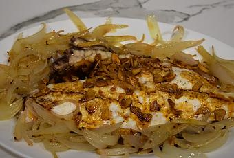 Sacamos la dorada del horno y emplatamos las doradas alrededor la cebolla y echamos el refrito encima de la dorada.