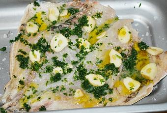 Una dorada de ración abierta y limpia.Dos dientes de ajoPerejil Zumo de medio limónSalAceite de oliva