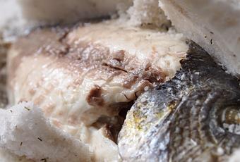 ELABORACIÓNPedir en la pescadería que nos limpien la dorada de escamas, aletas y que le retiren las agallas y las tripas (pero que la dejen entera).Poner la sal en un recipiente y espolvorearla con una cucharada sopera de tomillo y otra de romero, mezclarlos bien y humeceder con un pulverizador lleno de agua.En primer lugar coloca una base de un dedo de grosor de esta sal sobre la fuente del horno, pon la dorada encima y cúbrela con el resto de la sal dándole la forma del pescado y aplastando para que quede compacta y no se vea nada de pescado. Vuelve a pulverizar con agua.Hornea 30 minutos aproximadamente a 180ºC.Pasado el tiempo de horneado saca el pescado y vuelve a pulverizar con algo de agua después rompe la costra (que se habrá vuelto bastante dura) con ayuda de un cuchillo o tenedor y pala de pescado, retira la capa superior de sal y la piel se desprenderá con facilidad quedando la carne a la vista y lista para servir.Este pescado así preparado se sirve generalmente en la misma fuente en la que se ha horneado pues lo característico es que los comensales vean la dorada toda cubierta por sal, abrirla delante de ellos y que cada uno coja su porción. Al mismo tiempo se suele acompañar de algunas verduras al vapor o a la parrilla y al dente.Por muy poco esfuerzo y dinero puedes quedar como un verdadero anfitrión/a.José López