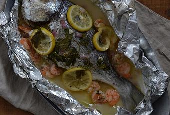 - Precalentamos el horno a 180ºC. Pelamos y picamos la cebolla y los ajos. Comenzamos a preparar el papillote, para ello, extendemos papel de aluminio sobre la superficie de trabajo, pero sin cortarlo del rollo (como aparece en la imagen). Colocamos sobre este la dorada, la cebolla y el ajo picados, rociamos con el zumo del limón, un chorrito de aceite, las gambas, el perejil y el eneldo. Salpimentamos.