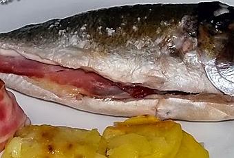 Para hacer esta receta no vamos a manchar ninguna cazuela, solo una fuente apta para microondas y los platos de servir.En tres pasos estará lista, primero cortar la cebolla en aros finos, colocar en la fuente, poner a punto de sal y un chorro de aceite de oliva, esto poner en el micro y a potencia máxima de cuatro a cinco minutos, depende un poco de cada horno.Mientras pelar y laminar las patatas, de dos a tres milímetros mas o menos, poner a punto de sal mezclar y reservar hasta que se termine la cebolla.Con la cebolla lista poner las patatas encima y cuando tengamos la mitad puesta colocar el bacon cubriendo las patatas, continuar hasta terminar las patatas, poner un hilo de aceite por encima y de nuevo al micro. Poner diez minutos en dos tandas de cinco minutos, dejando reposar un poco, pinchar con una puntilla para comprobar si la patata esta lista.Con la patata lista lo ultimo es poner las doradas limpias y abiertas por la mitad con las lonchas de jamón dentro, cerrar el pescado un punto de sal encima y de nuevo al micro, aquí lo mejor es ir probando por que no todos los hornos calientan igual, yo le he puesto cinco minutos y luego un par mas, quedo jugosa y bien cocinada. Para comprobar si esta listo el pescado la espina central se tiene que soltar con facilidad.On egin!!