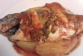 Ingredientes:Doradas, limón, patatas, cebollas, 1 vaso de vino blanco, tomate triturado, piñones, 3 dientes de ajo, perejil.Preparación:Regar con limón las doradas, hacerles unos cortes e introducirlas unas rajas de limón y añadirles sal.
