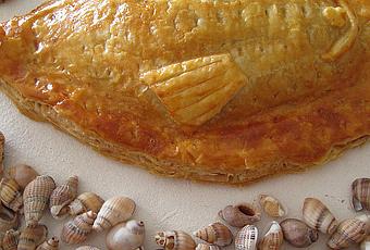 2 doradas de ración2 planchas redondas de hojaldre3 o 4 pimientos asados a la leña Conservas Rosara4 lonchas de bacon ahumado1 huevo batido sal gruesa