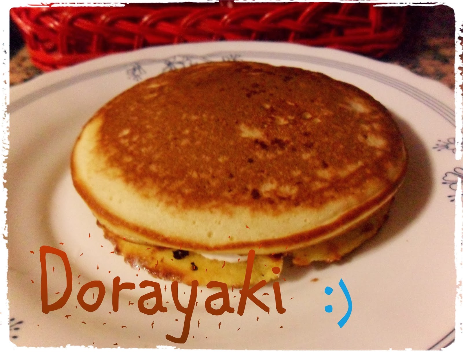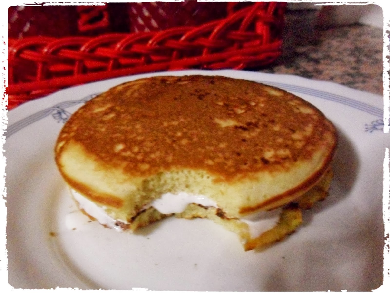 Siempre e mencionado mi afan por ese pequeño pais llamado japon, siempre e querido cocinar algo japones, pero me encontraba el problema de los ingredientes, incluso estos dorayakis no los e podido hacer en version receta tradicional-original, a causa de no poder conseguir anko (pasta dulce de judias) por lo que e tenido que tirar de cremas que si que se encuetran en españa y un poco de america, el que os muestro esta relleno de fluff (crema de nubes), pero hice otro que estaba relleno de nocilla con una pizquita de mantequilla de cacahuete.Con fluff, el de nocilla no le e podido sacar la foto