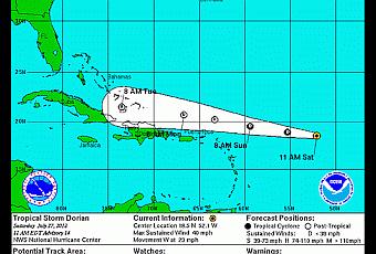 La tormenta tropical Dorian, afortunadamente no ofrece peligro para República Dominicana, en los actuales momentos, al tiempo que sus vientos han bajado a 65 kilómetros por hora, pronosticándose un mayor debilitamiento.A las 11 de la mañana, Dorian se ubicada en los 18.5 Latitud Norte y en los 52.1 Oeste, con un rápido desplazamiento hacia el Oeste, a 37 kilómetros por hora, a una distancia de 1,160 kilómetros al Este de las Islas Sotavento Norte.