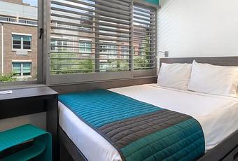El hotel tiene acceso gratuito a una hermosa terraza con vistas al horizonte de Manhattan. En otras palabras, puedes comprar tu propia comida y subirla a la mesa de la terraza en silencio. Hay un metro cerca para que pueda viajar cómodamente.