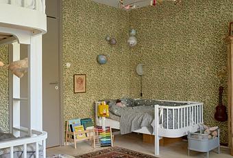 Este es un dormitorio compartido por 3 peques, casi nada :O, decorado con papel pintado floral en las paredes y suelo de madera de pino con una gran alfombra tipo persa. La litera es de madera pintada de blanco con camas amplias y una bonita forma con barandilla. Por lo demás algunos juguetes de los niños y peluches se encargan de que la decoración tenga un aire romántico y tierno.