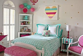 Un dormitorio a todo color, porque si algo les gusta a nuestros pequeños que van creciendo son los colores, nada de colores neutros ni blancos aburridos. Eso es lo que inspiro a su madre a crearle un dormitorio a su pequeña que cumplía ya 10 años. Su reto tenerlo preparado para el día de su cumple y así fue lo acabó la noche de antes. Una historia que a mi me ha enternecido, (esto del embarazo me saca mi vena mas sentimental) como una madre se esfuerza tanto para crearle a su hija la habitación con la que sueña. Como veis el fucsia no podía faltar combinado con un azul turquesa y el blanco para aclarar un poco esos colores tan radiantes.
