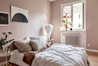 Este pequeño apartamento de 59 m² el dormitorio en un rosa empolvado es elegante, moderno y cálido, el color envuelve los elementos, los agrupa y arropa sin crear un excesivo contraste y sin estridencias.