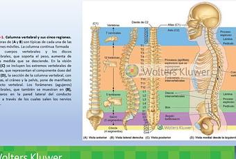 Columna vertebral y sus cinco regiones. Las vértebras de (A y B) son típicas de cada una de las tres regiones móviles. La columna continua formada