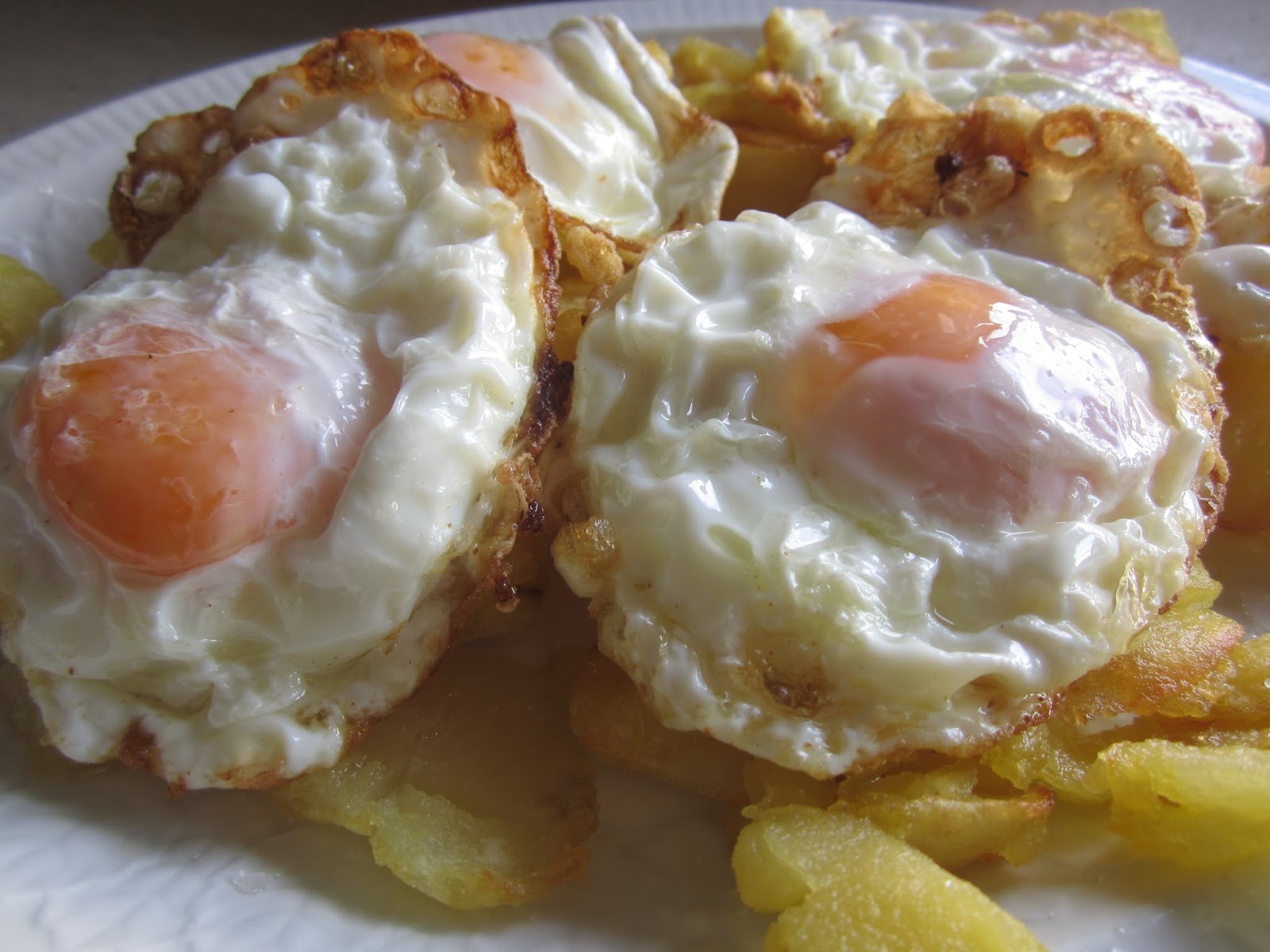 Y en el aceite donde hemos frito las patatas vamos a freír unos huevos para colocar por encima.