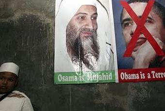 Un joven miembro del Frente de Defensores del Islam (FPI) junto a dos carteles, a la izquierda el líder de al-Qaeda Osama bin Laden y a la derecha el presidente estadounidense Barack Obama, durante una ceremonia en recuerdo del líder terrorista, en Yakarta, Indonesia.