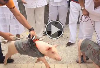 Dos cerdos, con los nombres de Fidel y Raúl fueron los protagonistas de un acto de solidaridad la mañana del domingo en la ermita de la Caridad del Cobre en la ciudad de Miami.