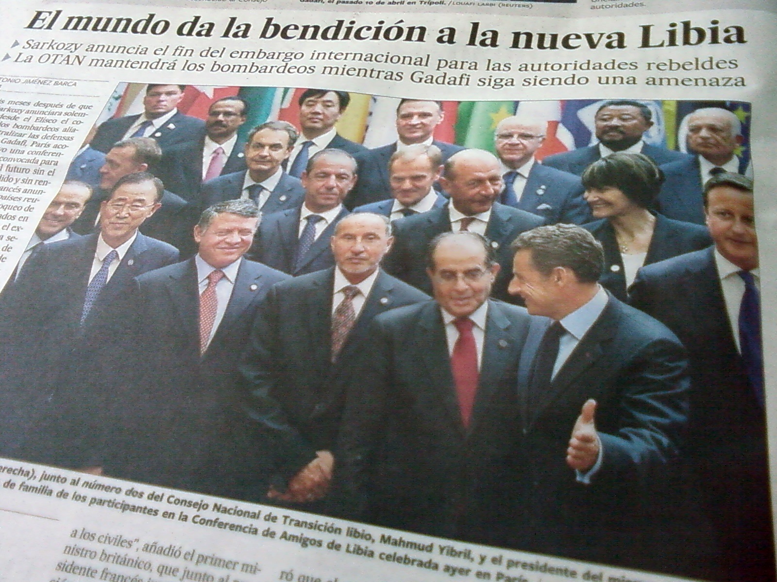 Leo en la sección Internacional de un diario nacional el siguiente titular: «El mundo da la bendición a la nueva Libia». Por un momento pienso si el periodista utilizó la expresión dar la bendición con doble sentido, o si se trata tan solo de una licencia retórica sin segundas intenciones. En todo caso, no se me ocurre otra forma más elocuente con la que describir la naturaleza de la Conferencia de Amigos de Libia, en la que Sarkozy, a modo de anfitrión, negocia con sus socios europeos, el gobierno de transición libio y diferentes organizaciones internacionales el futuro del país norafricano. Si el titular no era ya de por sí suficientemente iluminador, la fotografía que le acompaña despeja cualquier tipo de duda. Sarkozy adelanta su brazo en un gesto de invitación a dar un paso y tomar posición; algunos sonríen complacidos. No es para menos; Europa ha matado dos pájaros de un tiro. Por un lado queda ante la opinión pública como el divini redemptoris de la causa libia, adalid de la democracia entre los pueblos esclavizados por la tiranía. Y además, de postre se reparte el pastel del crudo, los gaseoductos y demás reservas energéticas libias. Moral y negocio se complementan. ¡Como para no estar contentos!