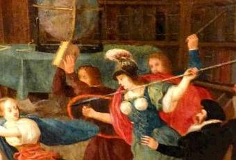El escritorio de Amberes de mediados del siglo XVII está decorado con pinturas de la escuela de Rubens, e iconografía de Virgilio Solis, que siguen episodios de las Metamorfosis de Ovidio. Nos llamó la atención la puerta de nuestra derecha: Venus y Cupido expulsados de la biblioteca por Minerva y ¿Calvino? Un globo, un compás y una escuadra sobre la mesa dan cuenta de los trabajos matemáticos de gabinete.