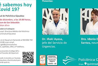 La neumóloga, Idania de los Santos y el Jefe de Urgencias, Iñaki Ayesa, ambos de Policlínica Gipuzkoa, hablarán de lo que se sabe hasta el día de hoy acerca del coronavirus en Gipuzkoa. Se puede reservar plaza llamando al 943 00 27 59 de 9:30 a 13:00 horas o por email: [email protected] proporcionando nombre, apellidos, dni y número de teléfono. Seguir el coloquio en directo en este enlace: https://www.youtube.com/watch?v=rHQQIfzBk_c&feature=youtu.beIdania de los Santos e Iñaki Ayesa, expertos del Servicio de Neumología y del Servicio de Urgencias de Policlínica Gipuzkoa respectivamente, serán quienes expliquen mañana jueves, día 17, a las 19.00 horas en el Aquarium de San Sebastián, todo lo que hasta ahora se sabe sobre la enfermedad. Sus signos y síntomas y cómo se ha avanzado en su tratamiento. Qué medidas de precaución funcionan y cómo poder intentar prevenir la enfermedad. También expondrán qué tipo de tratamientos se pueden recibir en el trascurso posterior a haber sufrido el Covid. A la espera de la llegada de la vacuna son muchos quienes desean ser parte de la población vacunada, pero también hay muchas personas que tienen dudas. Se están realizando en torno a 8.000 test Covid diarios en Euskadi y hay por encima de 100 pacientes hospitalizados en las Unidades de Cuidados Intensivos. Son alrededor de 30 las personas hospitalizadas en planta y han vuelto a crecer los positivos en las residencias de ancianos, aunque esta semana la tasa de positividad ha bajado un 5% en Euskadi por primera vez en varios meses. Hay medidas que están costando, sobre todo, las referentes a la vida social, a la vista de lo sucedido el último fin de semana con la apertura de la hostelería. Pero, ¿qué se sabe a día de hoy del Covid?, ¿qué test funcionan para diagnosticarlo y cómo acceder a ellos?, ¿hay que vacunarse?. A estas y otras cuestiones responderán en este próximo Aula de Salud. El Aula de Salud es un evento híbrido, para facilitar la asistencia presencial reservando plaza previamente; o de manera online, a través del canal de YouTube del Aquarium, que permitirá participar en el coloquio desde casa. Y para quien no pueda asistir el jueves 17, podrá verlo otro día en el canal de YouTube de Policlínica Gipuzkoa y Quirónsalud. Se puede reservar plaza llamando al 943 00 27 59 de 9:00 a 13:00 horas o por email: [email protected] proporcionando nombre, apellidos, dni y número de teléfono. Seguir el coloquio en directo en este enlace: https://www.youtube.com/watch?v=rHQQIfzBk_c&feature=youtu.be