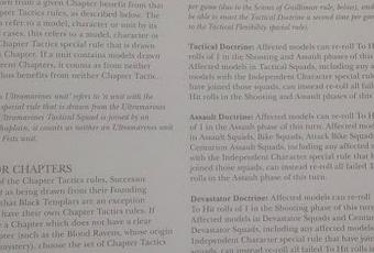 He hecho un repaso rápido al codex anterior.Hay algunos cambios,sobre todo en Templarios Negros(Que mejoran bastante y se acercan mas a cuando eran un codex propio en 4ª),Salamandras y Guardia Cuervo,que darán pie a algunos combos nuevos...Cicatrices Blancas y Puños Imperiales tienen algunos cambios también,como los los Ultramarines que parece que pueden usar hasta dos veces una de las tres Doctrinas de combate y el resto una vez por partida una vez.Manos de Hierro siguen igual,sin cambios.Hay retoques aquí allá,pero en lineas generales no son tantos como se esperaban.