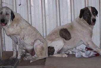 A estos dos mastines les han abandonado junto a una sucia caseta de obra y estan tan asustados que no se atreven a salir de alli, la caseta se pone ardiendo con el calor pero ellos siguen alli dentro, son macho y hembra, ella tiene las tetas de haber dado de mamar, creemos que se quedaron los cachorros y a ellos los echaron a la calle, alguien puede hacer algo por ellos, por favor??