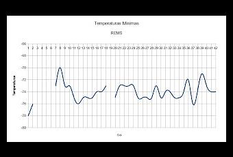 Temperaturas mínimas (en ºC) medidas por REMS.Según los datos aportados por REMS, la temperatura mínima media en Marte durante esta época ha sido de -74.18º C, aunque se puede apreciar un claro máximo en el sol 8 de REMS donde la temperatura llegó hasta los -70º C. Por contra, el primer sol que REMS tomó datos se pudo observar un mínimo de -78º C.