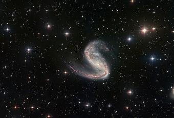 La galaxia Meathook (Gancho de Carne), o NGC 2442, en la constelación austral de Volans, es fácilmente reconocible por sus brazos espirales asimétricos. Se cree que la apariencia torcida de la galaxia es causada por interacciones gravitacionales con otra galaxia en algún momento de su historia, si bien los astrónomos no han podido hasta ahora identificar con certeza la causa.