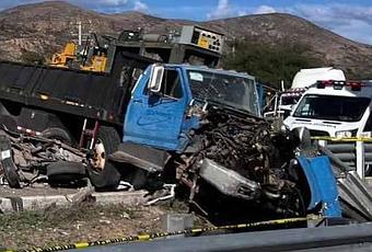 SLP.- Este día se registró un fuerte accidente donde se vieron involucrados un camión tipo torton cargando maquinaria y una camioneta Nissan de cabina blanca, falleciendo dos personas en el lugar del accidente.