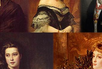 Carlos, Elvira, D. Francisco, Catalina y Luisa. Los cinco personaje principales de Dos mujeres, inspirados en conocidos retratos de la pintura universal. En la composición solo falta la profética Doña Leonor que EPD.