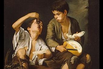 El pintor representa la vida de mendicidad y pobreza de Madrid, que a pesar de ser una de las ciudades más importantes y con más comercio de la península, por esa misma razón, era también una de las que recibía mayor número de indigentes. A esto hay que añadir los estragos de la peste y la profunda crisis económica y social a que había conducido la monarquía absoluta de la Casa de Austria. Todo ello contribuyó a la miseria y práctica del pillaje. Esta época fue llamada el Siglo de Oro, denominación especialmente utilizada en lo que al terreno cultural se refiere. Así en esta pintura, los niños se encuentran vestidos pobremente con las camisas medio destrozadas, pero con muestras de cierta alegría en la glotonería con que consumen las frutas, seguramente robadas. Esta interpretación profana y cotidiana, muestra el conocimiento que el autor tenía de la escuela italiana, influido principalmente por Caravaggio, quizá en los pequeños «Bacos» realizados por este pintor cincuenta años antes.