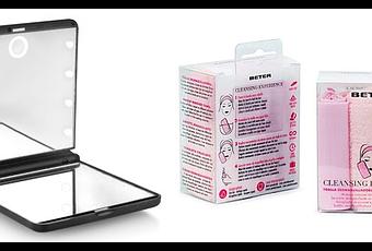 Dos productos imprescindibles de Beter en todos los kit de belleza: por un lado, OOOH!!! Light Touch, un espejo portátil que incorpora luz LED, un objeto de auténtico deseo; y por otro lado, Cleansing Experience, un kit para desmaquillarse la piel muy práctico además de sostenible.