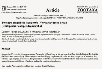 ABSTRACT:Newportia (Newportia) spelaea n. sp. and Newportia (N.) potiguar n. sp. are here described from Bahia and Rio Grande do Norte State, respectively. These two species show highly troglomorphic traits, such as elongation of antennae, legs, ultimate legs, tergites, pronounced depigmentation and reduced sclerotization of the cuticle. Both species occur in caves located in a semi-arid biome (Caatinga) and can be considered troglobites.