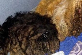 Después de ser desinsectados, alimentados y aseados, debajo de esa capa de pelo mugriento se encontró a dos simpáticos perros.