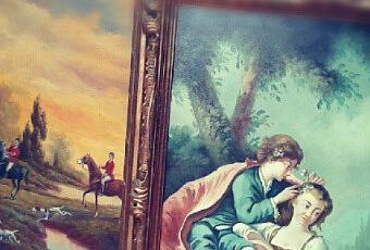 Ni corto ni perezoso le dije que sí, que yo lo "adoptaba", así que el sábado pasado me fui hasta Arrona, un idílico barrio de la localidad de Cestona, a unos kilómetros de San Sebastián a por el cuadro. Cuál fue la sorpresa cuando allí me esperaba otro cuadro más, este más pequeño, una delicada "escena de amor cortesano" (así lo ha denominado mi amiga María, del blog "Tránsito Inicial", y a mí me encanta la definición), también con un marco estupendo.