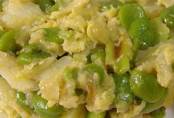 250 gr de habas peladas2 manojos de ajos tiernos2 cebolletas200 gr de bacalao desalado y desmigado2 patatas medianas4 huevosaceite de oliva y sal