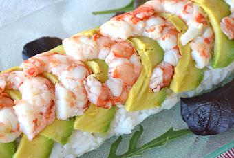 - Cubrir la alfombrilla de sushi con una hoja generosa de papel film y disponer alternativamente una lámina de aguacate y medio langostino hasta completar la longitud del rollo.