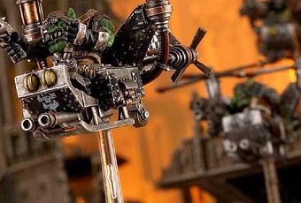 Cuando vi esta imagen sacada del codex Orkoz de 7ª,me vinieron dos cosas a la cabeza.La primera fue que de nuevo habían metido la pata al dejar visible en la foto la caja de plástico transparente(De estas que venden en los "chinos" para hacer de costureros,botiquines o lo que sea y que los aficionados a los wargames usamos para dados o miniaturas,por piezas o enteras) en la que se apoya la figura del Koptero en primer plano.La segunda es el Koptero en si.Bueno,los Kopteros,pero son el mismo con un cambio en el arma del piloto.El que esta en primer plano es el original sin modificar.Es curioso que usasen estas minis en el codex de Orkoz y en el sub-codex dedicado a la "Bestia de Armageddon" sacasen los Kopteros de la caja de Black Reach(La caja de inicio de 5ª).Los de la imagen son de metal y en realidad es una figura de personaje especial,solo que no es un personaje orko de W40K realmente,si no de un juego de Especialista.El juego de Especialista favorito de los jugadores de pieles verdes:Gorkamorka.Damas y caballeros,niños y niñas,tengo el placer de presentarles a Dregmek Blitzkart.Dregmek Blitzkart era un mekaniko de Mekaburgo encargado de reconstruir el pecio Gorkamorka para que los orkoz se pudieran marchar de Angelus y volver al Waaagh!Pero estaba muy obsesionado con el tema de que los orkoz pudieran volar,tanto que robo piezas que se usaban para reconstruir el pecio y construyo un Koptero,por lo que tuvo que huir de Mekaburgo por su "blazfemia" mientras gritaba:"Volveré,pandilla de retrazadoz idiotaz!Ya vereiz!".En el juego era el único personaje especial con vehículo del juego y tenia una serie de reglas bastante graciosas...como todo lo del juego,dicho sea de paso.Pero lo mas importante es que este fue el primer Koptero de los orkoz y que sirvio de inspiración para los siguientes,en especial la parte del piloto y no tanto la "makina".La idea de este personaje,hasta donde se es de Gav Thorpe,que creo el suplemento y el juego.