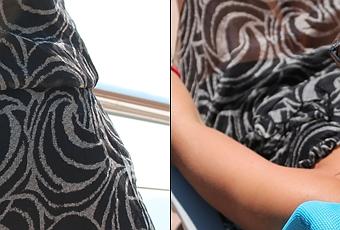 This is a chiffon dress with color in predominantly black and gray streaks, also has ruffles on one side and is strapless. Maybe I saw too short, so I decided to use it to get around town and even down to the beach as a kaftan.