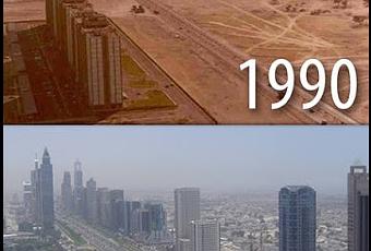 Como se puede ver claramente en la imagen, se empezó a construir todo cuando no había más que un edificio residencial lineal de hormigón, que sorprendemente sigue en pie hoy en día, pero lo que antes era una carretera a ninguna parte, es hoy en día una autopista y la principal arteria de la ciudad, la Sheikh Mohammad Bin Zayed Road (E311), que tiene oficialmente 140 km de longitud, pero que ese nombre sólo lo recibe mientras discurre por dentro de la ciudad de Dubai. En ambas fotos el mar queda a la derecha de las mismas, y por delante del edificio y paralela a la carretera discurre la linea de metro no conducido por el ser humano, más larga del mundo.