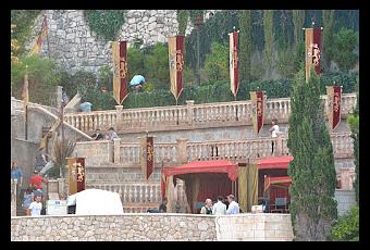 Esta fenomenal secuencia necesitaba rodarse en algún lugar frente al mar que no fuera transitado. Las labores de caracterización debían ser particularmente intensas y se necesitaban semanas para preparar el escenario. El equipo de producción encontró el lugar idóneo alrededor del atrio del Hotel Belvedere. Este hotel fue, durante una época, uno de los mejores de la región pero problemas económicos diversos obligaron a su cierre. Ahora, mientras espera nuevos inversores que realicen la restauración, se ha convertido en un edificio fantasma que destaca especialmente en la costa este de Dubrovnik, dentro del barrio de San Jaime. La instalación no es accesible para los visitantes pero se puede contemplar desde el barco que lleva a la isla de Lokrum. Desde la costa, los habitantes de la zona sí que pueden acceder al atrio. Algunos han dejado consignas de apoyo al equipo de fútbol más importante de la región, el Hajduk Split. Antes del rodaje, incluso habían pintado el escudo del club en la terraza que, posteriormente, fue decorada con el escudo Baratheon - Lannister. Incorporamos varias fotos realizadas desde el mar (el atrio es visible en la parte inferior izquierda de la instalación) y también una instantánea ajena que muestra el estado actual de la terraza. Los restos del escudo aún son visibles.