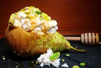 Cortamos la pera un poco más arriba de la mitad. Vaciamos un trocito para quitarle las pepitas. Y rellenamos con la mezcla de pistachos a trocitos junto con el requesón y terminamos con una buena miel.