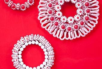 Seguro que conoces esos caramelos duros de fresa y nata que se venden tanto en forma de pequeños caramelos, como imitando pequeños bastones. Pues bien, ¿Qué te parece hacer con ellos divertidas coronas que colgar o usar como “mantelito” del centro de mesa?. En la imagen te mostramos tres posibles diseños a realizar.