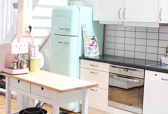 La primera palabra que se me pasó por la cabeza al ver esta preciosa casa fue DULCE. Sus colores, pastel perfectamente combinados y todos esos pequeños detalles que la hacen tan apetecible me encantaron. Para mi lo mejor el papel pintado, el collage en la pared de la entrada y la famosa nevera SMEG que siempre me ha vuelto loca, lástima que sigo sin convencer al Sr. J. By sukkertoyforoyet