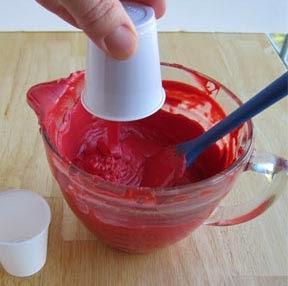 Hay que derretir el chocolate rojo, siguiendo las instrucciones del paquete y lo ponemos en un recipiente, esperamos a que se enfríe un poco para que al ponerle al vaso la capa no sea tan delgada.